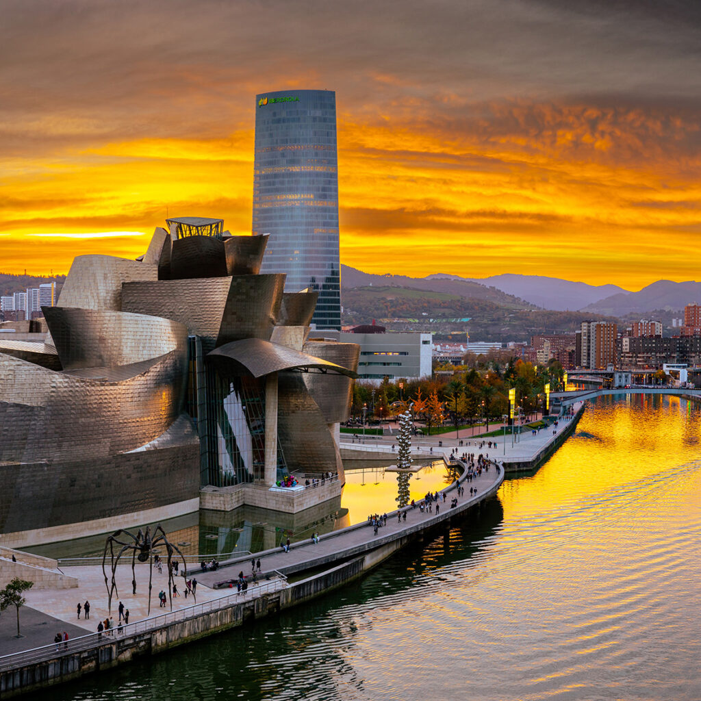 Bilbao, just 43 km from Bilbao, the largest city in the Basque Country. In addition to the Guggenheim Museum, it is notable for the Hanging Bridge, declared a UNESCO World Heritage Site, and the Old Town with its cobblestone streets, pintxo bars, and historic buildings. The city perfectly combines avant-garde and tradition, becoming a cultural and architectural landmark.